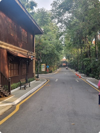 아침이 되어 야외 풀장이 있는 호텔 내부 거리를 걷고 있습니다.